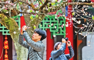 连日来,昆明黑龙潭龙泉观中的两株有着400多年树龄的明代古梅“龙潭粉”相继开放,繁花枝头香满园,吸引众多市民前来观赏。“龙潭粉”是云南独有的梅花品种,其花色白中带粉,是早梅品种中最早开放的梅花。目前,昆明黑龙潭公园已拥有“龙潭粉”、“红怀抱子”等珍贵品种古梅花69株,树龄最高的“唐梅”已有1300多年的历史。本报记者 杨峥 摄