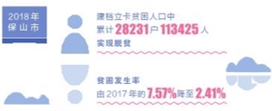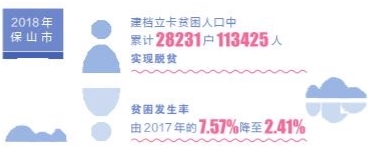 2018年,保山市脱贫攻坚取得扎扎实实的新成效:在建档立卡贫困人口中,全市累计有28231户113425人实现脱贫,贫困发生率由2017年的7.57%降至2.41%,贫困村出列165个。其中昌宁县、龙陵县的贫困发生率降至1.62%、1.68%,达到脱贫摘帽标准。