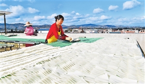 春节将至,在玉溪市江川区九溪镇鸡窝村委会,九溪姊妹糍粑厂的史自芬姐妹俩正忙着晾晒刚制作好的糍粑,她们制作的糍粑年销量达20多吨。糍粑是九溪镇的传统特色美食,春节期间特别受欢迎。