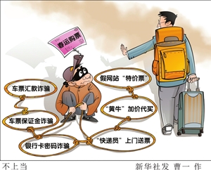 新华社深圳1月13日电(记者 周科) 2019年春运即将到来,不少旅客正在通过电话或网络抢购车票,而一些不法分子也趁机谋划种种购票骗局,骗取旅客钱财。深圳市反电信网络诈骗中心总结近期出现的案例提醒广大旅客,购票要谨防以下六种骗局。 一是假网站喊你来买“特价票”。不法分子制作虚假购票网站,声称售价打折或百分之百有票,待购票者上当后再以信息不全等理由要求购票者补全银行卡账号、密码等重要个人信息,然后骗取钱财。 二是“黄牛”加价帮你代买。不法分子伪装成“黄牛”,声称自己有票,只需在原价基础上多加一二百元即可代买。但其实,这些“黄牛”利用现有的火车票,用修图软件修改票面上的信息“以假乱真”。 三是“快递员”上门送票。以购票成功、“快递员”上门送票为手段,假意约见购票者在某地见面给票,同时又要求购票者的亲友在银行门口等待,接到电话再汇款。随后,通过“来电任意显软件”冒充购票者的手机号给其亲友打电话让其汇款,利用购票者尚未与亲友进行联系的时间差骗取汇款。 四是银行卡密码诈骗。冒充“客服”以种种理由要求购票者向指定账户付款,或利用购票者对网上支付不熟悉的特点,骗其输入银行卡账号、密码,窃取这些信息后盗取卡内的存款,从而达到诈骗的目的。 五是车票保证金诈骗。冒充“客服”要求先付一定数额的订金或保证金后才能出票,然后利用购票者急于拿到票的迫切心理,以种种理由诱使追加订金或保证金。 六是车票汇款诈骗。冒充“客服”以种种理由拒绝使用正规网站提供的第三方安全支付,或假冒火车站内部工作人员等骗其直接汇款到个人账户。