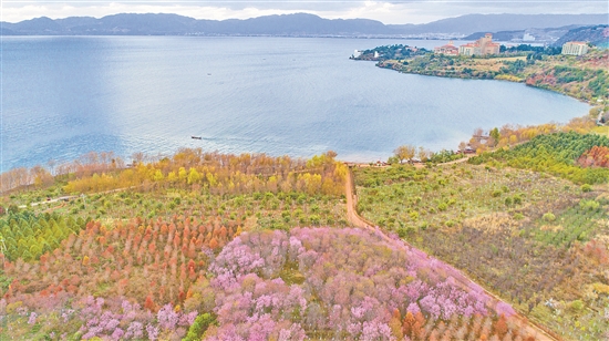 近日,澄江县右所镇大湾村附近的湖岸边,冬樱花与周边红色的中山杉、绿色的香樟相互映衬,绘就一幅绚丽的冬日生态美景图。
