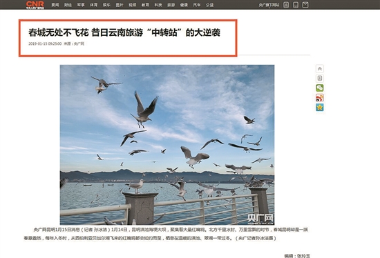 1月14日,昆明滇池海埂大坝,聚集着大量红嘴鸥。北方千里冰封、万里雪飘的时节,春城昆明却是一派春意盎然。