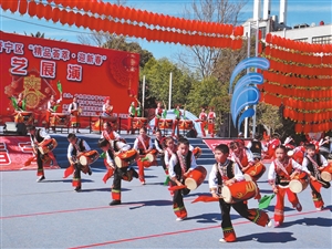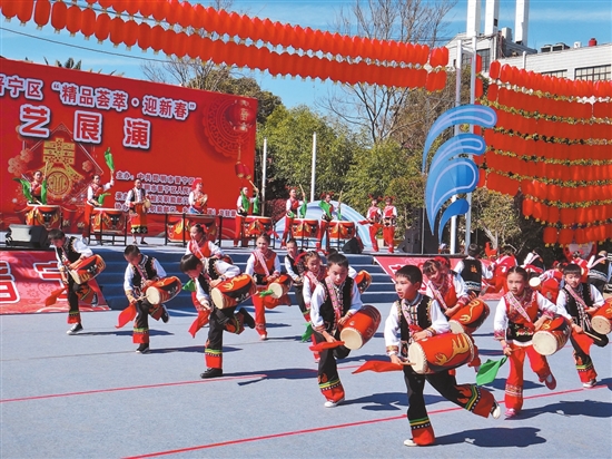 日前,晋宁区2019年“精品荟萃·迎新春”文艺展演活动在郑和文化广场举行,晋宁区各界人士、各族群众千余人欢聚一堂,喜迎新春、共享欢乐时光。图为中小学生在表演源自该区双河彝族乡的云南省非物质文化遗产“秧老鼓舞”。