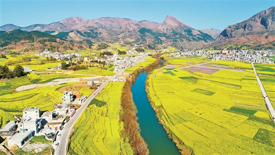 初春时节,罗平县油菜花盛开,黄花、碧水、群山、村舍相映成趣,透出浓浓春意。图为2月10日拍摄的油菜花田(无人机拍摄)。 新华社发 毛虹 摄