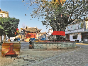 漫步在村里,平坦的青石板路,干净得像水洗过一样。白族民居的青瓦、白墙,令人赏心悦目。村中心,有一棵30米高的大青树,与东面的古戏台、西面的福海寺和本主庙处于同一中轴线。小溪穿村而过,清澈见底。