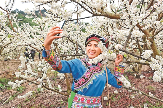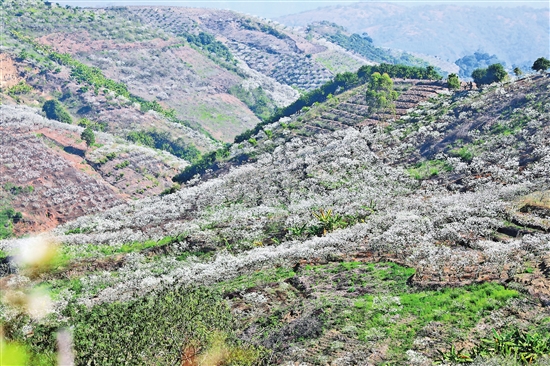 近日,元江哈尼族彝族傣族自治县曼来镇上万亩李花竞相开放,连绵数公里的花海成为当地一道独特的风景。民居零星掩映在洁白的花树之间,充满诗情画意,令人沉醉。