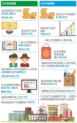 本报记者 茶志福 唐薇 喻劲猛 2月17日,昆明市第十四届人民代表大会第四次会议开幕,细观市长王喜良在此次大会上所作的《政府工作报告》(以下简称《报告》)可发现:2018年昆明奋发努力、成绩颇丰,报告里提到的“第一”“之最”或“金奖”有8项。2019年,面对新的挑战和机遇,将如何撸起袖子加油干?昆明市也做出了计划,力争重点通过抓好9个方面的工作,开创区域性国际中心城市建设新局面。 2018,昆明拿下多个“第一” 去年,昆明通过踏实努力收获了如下“总成绩单”:实现地区生产总值5206.9亿元、增长8.4%;固定资产投资增长5.5%;一般公共预算收入595.6亿元、增长6.2%;城乡居民人均可支配收入分别达42988元和14895元、增长8%和8.7%;社会消费品零售总额2787.4亿元、增长10%;居民消费价格上涨1.7%;单位地区生产总值能耗下降7%。 记者从《报告》所谈及的各领域“单科”成绩中,梳理出了至少8项“第一”“之最”和“金奖”—— 完成税收477.1亿元、增长16.1%,占一般公共预算收入80.1%,财政收入质量居全省第一; 规模以上工业增加值增长14%,增速居全国省会城市第一位; 全市进出口总额增长67.6%,增速居全国省会城市第一; 市本级行政许可事项精减到80项,为已公布行政许可事项的省会城市中最少; 滇池全湖水质达到Ⅳ类,为1988年建立滇池水质数据监测库30年来最好水平; 主城空气质量优良率达98.9%,为2013年执行国家空气质量新标准以来最好水平; 昆明荣获联合国第18届“国际花园城市”金奖; 昆明在“2018世界春城”评选中排名全球第一。 天道酬勤,这8项最为亮眼的成绩,印证了昆明去年在经济发展、改革开放、环境治理、城市建设等领域所下的功夫。当然,2018年,昆明市看得见摸得着的成就远不止上述这些,在三大攻坚战、乡村振兴、五网建设、“旅游革命”、大健康产业发展、民生保障等诸多领域,也收获颇丰。 2019,GDP目标预期增长8.5% 昆明对2019年要完成哪些主要目标,也做出了详细规划:地区生产总值增长8.5%左右;固定资产投资增长10%左右;一般公共预算收入增长5%;社会消费品零售总额增长10.5%;城镇和农村常住居民人均可支配收入分别增长8%和8.5%;居民消费价格涨幅控制在3%以内;城镇登记失业率控制在4%以内;万元生产总值能耗下降、主要污染物排放量削减完成省下达任务。 在日前召开的昆明市经济工作会议上,记者了解到,相比前3年,今年昆明的GDP增速预期目标有所收紧,但横向对比可发现,多地今年的GDP增速预期均较往年有所下调。其中,北京、上海、广州都将增速设定在6%~6.5%区间,重庆为6%,杭州、深圳为7%,南宁为7%以上,成都为7.5%左右,贵阳为10%,昆明的增速预期在全国直辖市和省会城市中依然居于前列。 事实上,昆明确定8.5%左右的预期目标,综合考虑了各方面因素:中央明确今年GDP增长预期目标为6%~6.5%,省委明确今年GDP增长8.5%左右。昆明确定增长8.5%左右,就是要与党中央和省委的部署相衔接。另外,昆明经济正由速度规模型向质量效益型转变,必须从“速度情结”“换挡焦虑”中摆脱出来,下决心推动高质量发展。 回望2018年,报告中的多组数据显示:结构优化的信号无疑是积极的。展望2019年,昆明将认真落实省委、省政府打造“三张牌”的部署要求,坚持走“两型三化”为方向的高质量发展路子,在转变发展方式上实现新突破。 今年,昆明要干9方面大事 如何让2019年的预期目标从蓝图变为现实?昆明市将通过9大抓手来确保。 着力培育壮大新动能,不断夯实高质量发展的产业支撑。打造“绿色能源”牌;大力发展数字产业,力争全市信息产业产值增长20%;提速发展大健康产业,确保增加值增长10%以上;加快发展现代服务业,深入推进“全域旅游”和总部(楼宇)经济。积极培育发展新增长极,推动滇中新区跨越发展,石化产业等新兴产业集群扩大规模。继续开展“大招商、招大商”,探索资本注入式招商。 继续打好三大攻坚战,逐步解决发展不平衡不充分问题。坚决打好防范化解重大风险攻坚战,重点防范化解P2P网络借贷等互联网金融风险,政府债务规模有效降低。坚决打好污染防治攻坚战,确保滇池治理“十三五”规划项目启动率达到90%,确保城市空气质量达国家二级标准。坚决打好精准脱贫攻坚战,完善返贫预警机制,全年完成15万人以上的农村劳动力转移就业,建立易地扶贫搬迁后续工作机制。 着力抓好城市规划建设管理,不断提升城市品质。盘活利用8012亩闲置土地,持续打好拆临拆违大会战。开展重点街路、节点、老旧小区微改造,抓好历史文化建筑保护。新增高速公路里程100公里以上,力争4号线、6号线二期具备通车条件,建设36条城市道路,启动5G网络区域性试点改造提升63个、新建扩建14个集贸市场,新增机动车泊位1.2万个。 坚持农业农村优先发展,全面推进乡村振兴。打造昆明“绿色食品牌”,推动花卉、蔬菜等“6+2”特色产业发展。力争建制村生活污水处理设施覆盖率达85%,农村无害化卫生户厕覆盖率达到80%以上等。培育新型职业农民2000名。打造10个各类型特色小镇,建设100个农村宜居示范村、200个美丽乡村。 聚焦重点领域和关键环节,全面深化改革。促进房地产市场平稳健康发展,为企业降成本300亿元以上,全面落实“一部手机办事通”,打造“不打烊”的政务服务专区。抓好农村集体产权制度改革试点,深化国资国企改革等。全面实施市场准入负面