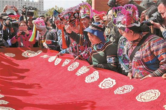 本报讯(记者 侯婷婷 李秋明) 2月20日,在永仁县赛装文化广场,9位非物质文化遗产传承人和刺绣工艺大师共同为70米刺绣长卷开针,上千名彝族姑娘身着节日盛装,齐齐举起手中的绣花针,在长卷上秀出活灵活现的图案,表达对伟大祖国的祝福。丝路云裳·七彩云南2019民族赛装文化节千人同绣“神州锦绣”刺绣长卷开针仪式,将本届盛会推向高潮。 据悉,本届赛装文化节系列活动将贯穿全年,在国庆节期间“丝路云裳·七彩云南2019民族赛装文化节广场舞大赛”上举行千人同绣刺绣长卷收针仪式,长卷作为云南省庆祝新中国成立70周年的作品。 本届赛装文化节以“丝路云裳 美美与共 喜庆新中国七十华诞”为主题,以弘扬赛装之源、挖掘彝绣之根、展示服饰之美、留住文化之魂、推动产业发展、培筑艺术之基为目的,由4个主体活动和7个配套活动组成。当天,一系列丰富多彩的活动同期开展。由楚雄州委宣传部、上海广播电视台联合摄制的本届赛装文化节形象片《彝乡之恋》宣布开机,预计于今年6月可与观众见面。