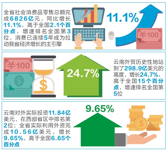 本报记者 韩成圆 刘子语 2月21日,云南省亮出2018年商务工作成绩单。过去一年,按照中央工作要求,云南稳外贸促消费,表现抢眼;“走出去”“引进来”并进,对外开放水平和层次不断提高。2019年,云南将落实供给侧结构性改革“巩固、增强、提升、畅通”八字方针,着力做好促消费、稳外贸、稳外资工作,努力推进经贸强国建设,推动云南高质量发展。 消费规模持续扩大 2018年,全省社会消费品零售总额完成6826亿元,同比增长11.1%,高于全国2.1个百分点,增速排名全国第3位,消费已连续5年成为拉动我省经济增长的主引擎。 消费规模扩大、增速保持强劲增长的背后,是云南抓开拓、促升级,全力扩大社会消费的一系列努力。“我们创新实施了以‘完善便民消费、培育商圈消费、扩大绿色消费、构建现代供应链、开拓国际消费和改善消费环境’为重点的消费升级行动计划。学习借鉴经验的同时,谋划我省消费升级新思路和新方法。”云南省商务厅厅长赵瑞君介绍。 在北上广深等一线城市和香港、澳门特别行政区开设11个“云品”连锁专卖店;“绿色云品”系列活动足迹遍布长沙、杭州和武汉;推动“百胜中国必胜客扶业计划”落地丽江市永胜县,推动云南松露等野生食用菌、蔬菜、咖啡等进入百胜餐饮全国供应链。在全力打造世界一流的“绿色食品牌”背景下,云南持续助推绿色食品开拓市场,让“云南绿”遍及更多区域。 助推“云品”上行的主体也愈加丰富。据介绍,我省引入国内知名电商企业在17个县(市、区)开展以农产品上行为重点的电子商务试点,推进“云品荟”电子商务直供平台建设,加强与阿里巴巴、京东、苏宁、上海易果等知名电商企业合作,推动云南产品入驻平台销售产品库。 另外,云南扎实推进流通发展。持续抓好乡村新型购物中心建设,抓好商贸服务业发展,评审认定云南省第5批老字号,推荐一批餐饮企业入驻“一部手机游云南”平台,推动云南民族特色餐饮与旅游的融合发展。“云上营家”等一批第三方智慧物流信息交易平台建成运营,云南国际“现代物流云”综合信息服务平台即将上线运行;昆明市及8家企业获准开展全国供应链创新与应用试点,获准试点企业数量居全国前10位。物流新业态新模式加快发展,流通渠道更顺畅。 “2019年,我们将继续从供给侧发力,切实落实‘扩消费’政策,全面推进内贸流通发展。”赵瑞君表示。 具体来看,将开展步行街提升改造试点,推进城市社区便利化,提升实体商业设施和服务数字化。充分发挥京东“云南老字号”官方旗舰店作用,推动“老字号”等名优产品利用线上线下渠道加大品牌传播扩大销售。借鉴“双11”等线上方式,借鉴博览会、旅游节庆活动等线下方式,打造新的消费热点。 同时,将加大国内市场开拓力度,主动赴省外消费热点地区开展促销活动、布局营销网络(中心);巩固北上广重点市场,开拓长沙等市场。继续支持省外“云品连锁专卖店”的建设,扩大云南“绿色食品”影响力。此外,推进流通基础设施建设,支持企业绿色食品交易区、仓储中心、冷链配送中心和绿色仓储等建设,加快城乡便民消费服务中心建设。 外贸增长不断提速 2018年,云南外贸历史性地站到了298.9亿美元的高度,增长24.7%,高于全国15个百分点,增速排名全国第5位。 除了增速更快外,云南加快推进外贸转型升级,也让外贸成色更足、含金量更高。其中,服务贸易发展亮点纷呈,文化贸易工作实现重大突破。昆明市被国家认定为首批13家国家文化出口基地之一,省政府批复认定玉溪高新区为省级服务外包示范园区,云南海归创业园为省级服务外包示范基地。此外,我省大力拓展多元化市场,成功举办“永不落幕的南博会”等主题推介会活动,利用广交会等国内外知名展会,积极开拓中东等绿色食品市场。 建设对外开放平台、口岸通关不断提速,助力云南外贸“奔跑”更有底气和动力。我省推进国家级经济技术合作区和综合保税区建设,建立综保区招商引资项目库,整合招商资源,实现信息共享。2018年6月举行的第5届南博会,吸引3825家企业参展,456个项目签约,签约金额超8000亿元。 “云南全力加强口岸基础查验设施建设,助推口岸开放。”省商务厅口岸规划发展处负责人介绍,我省相关部门督导德宏傣族景颇族自治州、红河哈尼族彝族自治州、西双版纳傣族自治州和保山市加快推进进出口危化品查验场查验设施建设,督导推进天保口岸货运通道、磨憨口岸货运通道等项目建设。“去年前3季度,进口通关整体时间为49.81小时,比全国平均时间少31.12小时;出口通关时间1.32小时,比全国平均通关时间少6.34小时。云南通关速度在全国处于领先水平。”省商务厅口岸通关促进处负责人自豪地说。关检融合项目整合不断推进,中国(云南)国际贸易“单一窗口”不断完善,口岸通关更便利,也向外贸企业释放红利。 在谈及2019年云南外贸发展时,省商务厅相关负责人表示将全力确保外贸稳增长,推进国际贸易转型升级。该负责人介绍,我省将做大加工贸易规模,加大招商引资力度,积极承接沿海地区机电产品、有色金属、电子产品、纺织服装、玩具箱包、生物医药等重点领域产业转移。同时,扩大绿色食品出口。继续稳固东南亚市场,挖掘欧洲、港澳市场,开拓中东、非洲等市场。大力推进县域出口农产品质量安全示范区建设,推进大理白族自