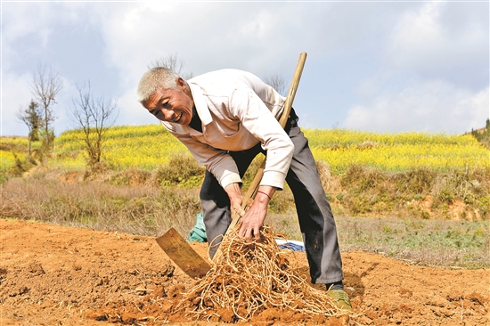 “去年10月份,我家种了两亩鱼腥草,亩产3500公斤至4000公斤左右,按每公斤批发价6元计算,一发鱼腥草就有两万多元的收入。”日前,在富源县十八连山镇卡锡村委会树林头村,村民周全坤一边翻挖着地里面的鱼腥草,一边分享着种植鱼腥草增收后带来的喜悦。 “趁这几天天气好,赶紧请村里的村民帮忙把成熟的鱼腥草采收完,力争在惊蛰前再种上一发,五六月份又可以采收销售,一亩地一年下来就可以挣个三四万元。”周全坤信心满满地说,不仅自己要种植鱼腥草富起来,还要带动村民们一起致富。 过去卡锡村委会以传统的玉米、烤烟等农业种植为主,产量低、产值小,经济基础薄弱,村民生活艰苦,是出了名的贫困村。近年来,该村委会紧扣产业结构调整和脱贫攻坚产业发展契机,在巩固玉米、烤烟、油菜等传统种植基础上,大力推广山药、猕猴桃种植,充分结合辖区气候条件、水土资源、交通优势等,积极鼓励农户开展鱼腥草种植,多渠道、多途径拓宽群众增收致富路径。 眼下正是鱼腥草收获时节,富源县十八连山镇天宝、卡锡、德厚等村组的鱼腥草种植户们,正在田间地块用锄头、用牛耕等翻挖着土里面的鱼腥草。而来自富源县城、贵州等地的批发商们早已在田间地块边或者村寨收购点等候,及时将村民们采收后的鱼腥草进行简单分类、清洗打包,统一运往富源、曲靖、昆明、贵州等地区出售。 看到周全坤种植鱼腥草收入可观,周边村民们也纷纷到周全坤家地里面务工并学习种植经验。“我在这里帮他采收和种植鱼腥草,一天除了管吃管喝外,还有100元的收入,既方便照顾家又不耽误农忙,还可以学到种植技术。”十八连山镇卡锡村委会新建村村民李小粉高兴地说。 在周全坤的示范带动和帮助下,周边村民们开始利用自家的闲置土地进行大规模种植。如今,十八连山镇天宝、德厚、卡锡、老屋等7个村委会已有80余户村民种植鱼腥草130亩,其中,贫困户11户种植鱼腥草30亩。 本报记者 张雯 通讯员 曹振华 文/图