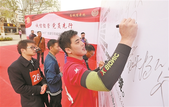 本报讯(记者 郎晶晶) “作为党员,我们更应该在诚信经营中作表率、当先锋。”3月15日,领到“党员经营户”的牌匾,在“诚信经营承诺墙”上签下自己的名字后,昆明市五华区佰腾数码广场的党员经营户翁建丽如是说。 3月15日,昆明市五华区“两新”组织党工委、五华区华山街道党工委以“党建引领新发展 立足岗位做贡献”为主题,在园西街区举办“3·15国际消费者权益日”活动。来自佰腾数码广场、园西电子广场、一二一数码城等商场的30余名商户代表在“诚信经营承诺墙”签名,承诺“保证商品质量、诚信守法经营、杜绝价格欺诈”。活动中,主办方还为诚信经营、乐于奉献的“党员经营户”授牌,为坚持“助人自助、提升自己”的园西街区IT党员志愿服务队授旗,激励广大企业党员亮身份、践承诺、做表率。 当天,五华区各街道党工委均依托辖区内商业街区和市场,组织开展了各具特色、亮点纷呈的“3·15国际消费者权益日”主题活动。 图为来自护国辖区的公司企业党支部悦跑队员在开幕式上参加诚信经营承诺签名活动。 本报记者 杨峥 摄