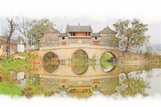 乡会桥位于建水县西庄镇新房村委会老易屯村,横跨泸江河东西两岸,占地面积700平方米,因清朝科举考试中的乡试、会试而得名,是建水县古桥中唯一的廊桥。经过近几年的生态环境治理,乡会桥面貌焕然一新,河畅、水清、岸绿、景美,村民的生活环境大为改善,外地自驾游游客越来越多。图为乡会桥的靓丽容颜。