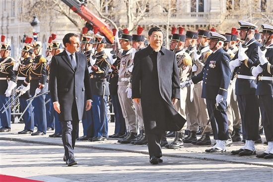 三月的巴黎碧空如洗,阳光明媚。凯旋门星形广场上,仪仗队和军乐团整齐列队,静候习近平的到来。
