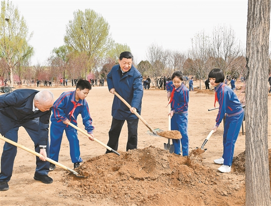 新华社北京4月8日电(记者 张晓松 林晖) 中共中央总书记、国家主席、中央军委主席习近平8日上午在参加首都义务植树活动时强调,要发扬中华民族爱树植树护树好传统,全国动员、全民动手、全社会共同参与,深入推进大规模国土绿化行动,推动国土绿化不断取得实实在在的成效。 春染大地,生机勃发。上午10时30分许,党和国家领导人习近平、栗战书、汪洋、王沪宁、赵乐际、韩正、王岐山等集体乘车,来到北京市通州区永顺镇,同首都群众一起参加义务植树活动。 植树点位于北京城市副中心绿心城市森林公园内,面积约500亩。这一地块原来建有化工厂等设施,拆迁腾退后用于绿化建设,未来将成为群众放松休闲的活动场所。 一下车,习近平就扛起铁锹,走向植树地点。正在这里植树的干部群众看到总书记来了,纷纷向总书记问好。习近平向大家挥手致意,随后同北京市、国家林业和草原局负责同志以及首都干部群众、少先队员一起挥锹铲土、围堰浇水,忙碌起来。 油松、国槐、侧柏、玉兰、红瑞木、碧桃……习近平接连种下7棵树苗。他一边劳动,一边向身边的少先队员询问学习生活和体育锻炼情况,叮嘱他们从小养成爱护自然、保护环境的意识,用自己的双手把祖国建设得更加美丽,祝他们像小树苗一样茁壮成长。 植树现场一片热火朝天景象。参加劳动的领导同志同大家一起扶苗培土、拎桶浇水,不时同身边的干部群众交流加强生态保护、坚持绿色发展的看法。 植树间隙,习近平同在场的干部群众亲切交谈。他指出,今年是新中国植树节设立40周年。40年来,我国森林面积、森林蓄积分别增长一倍左右,人工林面积居全球第一,我国对全球植被增量的贡献比例居世界首位。同时,我国生态欠账依然很大,缺林少绿、生态脆弱仍是一个需要下大气力解决的问题。 习近平强调,中华民族自古就有爱树、植树、护树的好传统。众人拾柴火焰高,众人植树树成林。要全国动员、全民动手、全社会共同参与,各级领导干部要率先垂范,持之以恒开展义务植树。要践行绿水青山就是金山银山的理念,推动国土绿化高质量发展,统筹山水林田湖草系统治理,因地制宜深入推进大规模国土绿化行动,持续推进森林城市、森林乡村建设,着力改善人居环境,做到四季常绿、季季有花,发展绿色经济,加强森林管护,推动国土绿化不断取得实实在在的成效。 在京中共中央政治局委员、中央书记处书记、国务委员等参加植树活动。
