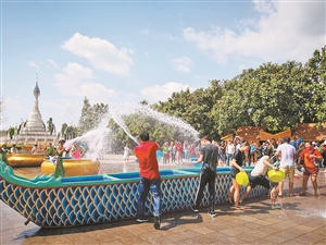本报讯(记者 李吒) “泼!泼!泼!”4月10日,2019傣历新年泼水节在云南民族村启幕。一场场泼水大战在傣寨广场打得酣畅淋漓,人们乐享“浑身湿漉漉,心里美滋滋”的独特节日体验。 泼水节是云南少数民族节日中影响较大、参与人数较多的节日之一。除傣族外,共庆泼水节的还有布朗族和德昂族等民族。当天10时40分,云南民族村傣寨白塔准时举行泼水节浴佛仪式。之后,泼水节正式开始。伴随着“水、水、水”的欢呼声,傣族姑娘、傣族小伙们洒水迎宾,来自四面八方的游客在接受祝福的同时开启了一天的泼水狂欢之旅。在傣历新年的狂欢中,游客们洗去过去一年的烦忧,激起对新年的美好期盼和向往。 据悉,泼水节活动将持续到4月14日。期间,民族歌舞表演将轮番上阵,游客还可品尝少数民族特色小吃,体验景区丰富多彩的民族文化。