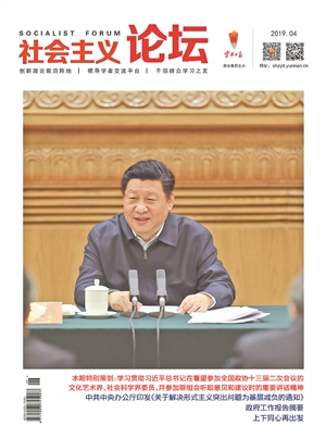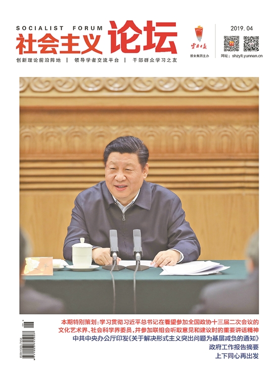 导言 肩负起培根铸魂使命………李平 重要文件 中共中央办公厅印发《关于解决形式主义突出问题为基层减负的通知》 重要文稿 政府工作报告摘要………新华社 上下同心再出发……新华社记者 把干部从一些无谓的事务中解脱出来…………………新华社记者 特别策划 做人民需要的哲学社会科学工作者………………………王传发 哲学社会科学研究要体现时代性 ……………………………王永华 培根铸魂是理论自信的基础工作 ……………………………李正亭 提升师德水平 展示师魂形象 ……………………………李长平 奋力谱写民生事业新篇章 ……中共云南省委党校习近平新时代中国特色社会主义思想研究中心 理论指导实践 明德引领风尚 ……………………………王海云 落实好立德树人根本任务 …滇西应用技术大学宣传统战处 专题调研 用学术讲政治促进“教研咨一体化”…………………………白亚鹏 强化“云花”地理标识和品牌影响力 ………王思慧 梅长青 李群 肖霄 临沧边民互市贸易情况及建议 ……中共云南省临沧市委政策研究室课题组 玉龙县打造以雪桃为主的“绿色食品”牌 ……………赵飞 赵金发 王安越 重视“非遗”文化传承 引导形成扶贫产业 ………杨俊文 崔茂乔 陶乔双 进一步落实好意识形态工作责任制…………………吴江 杨继培 在习近平新时代中国特色社会主义思想指引下——新时代 新作为 新篇章 六个“持续发力”谱写红塔区发展新篇章……………………瓦庆超 发扬互帮互助精神 决战决胜脱贫攻坚………李拥军 做政治过硬本领高强的宣传干部 ……………………………陈丽芬 构建全要素“绿色食品”产业体系 ……………………………刘艳丽 同担保护责任 共建生态文明 ……………………………王跃彪 实施好乡村振兴的文化铸魂工程 ……………………姜丝云 刘军 发现·求证·争鸣 西南联大冬青文艺社的前期 ……………………………李光荣 云南构建“健康丝绸之路”的建议 ……………………………郭培阳 深化云南少数民族艺术体系学术研究………………………毛祥麟 工作研究 发挥党校图书馆在教育培训中的作用………………………张湘江 多措并举加强乡镇文化建设 ………………………………陈敏 激发学校党组织建设创新活力 …………………张继文 包晓钟 思想新语 坚决破除形式主义…………白婧 虚则漂浮 实则深沉……和亚宁 把握党性修养要义………双凤鹤 退役不褪本色……………谭玉泉 《社会主义论坛》月刊 创新理论前沿阵地 领导学者交流平台 干部群众学习之友 订阅电话:0871-64195021 邮发代号:64-75 96元/年 本刊网址:shzylt.yunnan.cn 云南理论网:llw.yunnan.cn 投稿信箱:luntan@yndaily.com