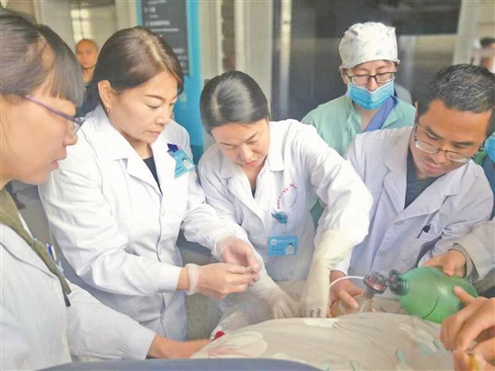 近日,昆明医科大学第一附属医院医学影像科技师李彬,在陈敏和张羽羽两名护师帮助下,用时25分钟成功挽救了一名68岁连续两次出现呼吸和心跳骤停患者的生命。 “当天上午,我和陈敏、张羽羽两名护师正准备进入影像大楼6楼介入手术室进行术前准备,忽然听到6楼电梯内两位家属惊慌失措的呼叫声。我们仔细一看,一位老人半躺在轮椅上,已经没有了生理反应。”李彬告诉记者,当时发现患者意识丧失、呼之不应,3人立即将患者就地平躺,观察到患者已无呼吸,口唇青紫,颈动脉无搏动,血压停止,肪博无跳动迹象。3人及时判断患者为呼吸心跳骤停。 “这时,我们马上施行徒手心肺复苏,张羽羽护师立即电话联系急诊抢救室、麻醉科等科室前来援助。”李彬向记者讲述了惊心动魄的抢救过程:进行胸外按压约一分钟后,患者恢复意识,但此时又出现意外紧急情况。老人嘴里竟含着一块糖果,口内液体黏稠,糖果随时可能滑入气道造成梗阻而窒息。此时,老人嘴巴紧闭,很难张开,于是李彬便轻轻地把左手食指和中指伸进老人口中掏糖果。结果老人紧紧咬住了他的指头,为保证患者安全,李彬忍住疼痛坚持用2根手指紧夹糖果不放大约5分钟,直至使用牙垫放入患者口中,李彬才将手指和糖果抽出,解除了危险。此时,李彬的2根手指已被患者咬烂。 令人意想不到的是,在准备安排患者转运之际,患者再次呼吸心跳骤停,大伙又投入了抢救,医学影像科胡继红主任医师和赵雷护士长也闻讯赶到现场抢救,陈敏护师熟练地穿刺开通颈外静脉通路,主诊的胸外科张璟主任带领医务人员赶到了现场,麻醉科医生对患者进行了气管插管。多学科密切配合、有条不紊,20分钟后,患者再次复苏成功,胸外科、麻醉科医生随即护送患者转入ICU。 医务人员沉着应对、及时施救,为患者获得新生赢得了宝贵时间。 本报记者 陈鑫龙
