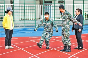 4月15日,杜富国在家人和战友陪伴下进行康复训练。新华社发