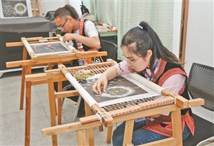 云南大学滇池学院针对特殊群体毕业生实施精准化就业援助,建立离校未就业毕业生信息台账,建立建档立卡贫困户家庭毕业生求职与就业状况信息台账,开展“一对一”精准化帮扶及就业推荐和服务工作,2018届105名建档立卡贫困户家庭毕业生全部就业,对于符合享受“求职创业补贴”的毕业生给予及时申报和发放补贴,2018年共有997名毕业生获得了求职创业补贴共计99.7万元。图为学习艺术刺绣的学生正在缝制作品。