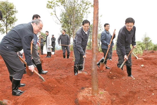 本报讯(记者 田静 张寅) 季夏的春城细雨绵绵,青山含黛。7月10日上午,省委书记陈豪、省长阮成发、省委副书记王予波等党政军领导到昆明市安宁市参加义务植树活动。 打造“美丽公路”是我省建设中国最美丽省份的具体行动,昆明-大理-丽江高速公路就是其中一条重点线路。上午9时30分,参加植树活动的省领导集体乘车来到位于草铺街道草铺村委会的昆大丽高速公路安宁段“绿色廊道”项目点,与省市机关干部、武警官兵一同挥锹铲土、培土浇水,栽下一棵棵滇润楠、乐昌含笑、肋果茶等树苗。陈豪与参加植树的当地干部边植树边交流,充分肯定了安宁市作为昆明重要工业区,森林覆盖率连续多年高于全市平均水平的经验做法。“云南生态建设和环境保护要抓好两件大事,一是治污,二是植树。”陈豪强调,各地区各部门要认真学习贯彻习近平生态文明思想,牢固树立和践行“绿水青山就是金山银山”的理念,坚持生态优先、绿色发展,持续开展全民义务植树活动,深入推进大规模国土绿化行动,打好污染防治攻坚战,不断提升城乡环境,让七彩云南绿起来、美起来。 植树活动结束前,陈豪一行现场听取了我省美丽公路建设情况汇报。他强调,美丽公路建设要与沿线路域环境整治、村庄风貌打造、城乡人居环境提升等工作有机结合,统筹推进。要推动省级各部门与州(市)、县(市、区)协同发力,各级政府与企业、社会团体密切配合,发动广大群众积极参与,涵养生态美、创建环境美、提升城市美、塑造乡村美、展现山水美,齐心协力把云南建设成为中国最美丽省份,努力成为我国生态文明建设排头兵。 省委常委,省人大常委会、省政府、省政协领导,省人民检察院检察长,驻滇解放军和武警部队领导,昆明市领导等参加植树活动。