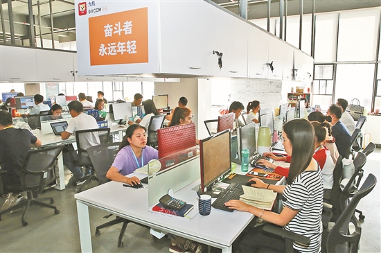 云南九机科技有限公司是一家以IT技术为支撑,以用户体验为导向的科技公司,在全国拥有200余家实体门店,2018年实现营收12.3亿元。公司成立以来,积极开展校企合作,建立大学生实习基地,定向培养相关技术人员。图为在该公司岗位上工作的年轻人。