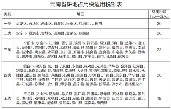 (2019年7月25日云南省第十三届人民代表大会常务委员会第十二次会议通过) 为了贯彻实施《中华人民共和国耕地占用税法》,合理利用土地资源,加强土地管理,保护耕地,云南省第十三届人民代表大会常务委员会第十二次会议审议了省人民政府提出的《云南省耕地占用税适用税额方案(草案)》。会议同意省人民政府提出的方案和省人民代表大会财政经济委员会审议意见的报告,决定: 一、云南省各县(市、区)耕地占用税适用税额,按照所附的《云南省耕地占用税适用税额表》执行。 二、占用园地、林地、草地、农田水利用地、养殖水面、渔业水域滩涂以及其他农用地建设建筑物、构筑物或者从事非农业建设的,适用税额依照当地占用耕地的适用税额执行。 本决定自2019年9月1日起施行。