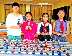 2016年9月,西关小学成立了工作室,在全校学生中开展超轻粘土彩塑工艺学习,受到了学生的喜爱。去年,师生共同制作的“植物园、民族装、社会主义核心价值观”三大系列彩塑作品获得全国学生作品大展一等奖。麒麟仙子、十二生肖、26个民族三个系列的作品正在申报外观创作专利。 图为王秀雯老师和学生一起展示获奖作品。