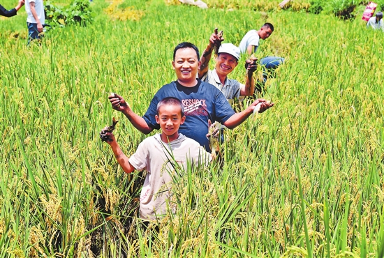 立秋时节,稻谷飘香。武定县田心乡3000余亩“谷花鱼”喜获丰收。 走进田心乡普龙村委会普龙村, 只见涓涓溪流环绕的稻田里,金灿灿的稻谷迎着微风轻轻摇曳,散发阵阵清香。稻谷间,养殖户们正忙个不停地追逐围捕“谷花鱼”,眼见一条条活蹦乱跳的肥美鱼儿被装进箩筐,人人脸上都荡漾着丰收的喜悦。 “今年雨水集中、雨量充沛,水稻生长好,‘谷花鱼’也长得肥美个儿大,家家户户都获得丰收。”普龙村建档立卡贫困户起大爹乐呵呵地说,“我家养了10多亩稻田鱼,产量在300公斤左右,按照每公斤50元价格计算,刨除每亩500元的鱼苗成本,将有1万元的纯收入。” 像起大爹家一样养殖“谷花鱼”的农户,在普龙、利米、鲁期和田心村委会还有很多。近年来,田心乡把实现农民“短、平、快”增收的产业作为脱贫攻坚的重要举措来抓,充分利用当地气候湿润、降水集中、水利基础条件较好的资源优势,在稻田里放养生态鱼。 每年3、4月份,当地农户们在插秧1个多月后放下鱼苗,自此就不能再给稻谷喷洒农药及化肥。待到7月份稻花绽放,纷纷落在田里,鱼儿既可以吃到香喷喷的稻花,又能享受到稻田里的微生物美味,长势喜人,品质优异。 “‘谷花鱼’肉质鲜美,又是绿色原生态产品,这几年在市场上备受青睐,供不应求。”田心乡党委有关负责人介绍,今年全乡共养殖“谷花鱼”3000余亩,预计产量10余万公斤、产值500多万元。 本报记者 饶勇 通讯员 贺明辉 包志春