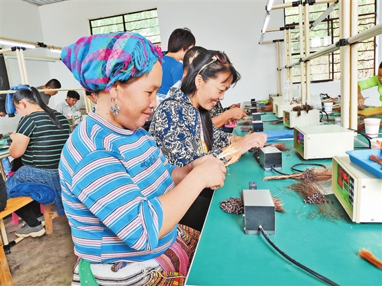 近日,记者来到马关县小坝子镇田湾村委会达凤村老校舍,一副“扎根边疆心向中央、门前打工生活轻松”的对联格外醒目。自从文山意德电子科技有限公司在这里设分厂后,闲置多年的校舍响起焊接声和切线声,奏响了固边富民新乐章。 小坝子镇田湾村委会是一个苗族聚居的边境村寨,全村共有建档立卡贫困户419户1585人,目前已有380户1472人脱贫。 田湾村党支部书记王正良向记者介绍:“我们村土地不多,靠种地挣钱养家难,很多年轻人都外出打工了,留守儿童、老人无人照顾,守土固边也成了难题,群众迫切希望不出远门就能挣钱。” 为此,小坝子镇党委积极引导,党组织牵头、党员带动、群众参与,引进文山意德电子科技有限公司,利用达凤村小组管理的闲置老校舍作为厂房,组建了电子加工扶贫车间,吸纳边境劳动力生产半成品电子元件,促进村民增收。 目前,达凤电子加工厂已建成集分线、钩工、切线、焊接、检验、清洗为一体的生产线,为边境群众提供就业岗位150个。自今年2月投入运营以来,扶贫车间帮助70余户边民增收,让他们“挣钱顾家两不误,足不出村能脱贫”。 近年来,马关县不断加大就业扶贫车间创建力度,采取政策宣传引导,加大招商引资力度,积极协调场地等措施,鼓励企业、社会组织和个人在贫困乡(镇)、村(社区)建设就业扶贫车间,吸纳贫困劳动力就近就地就业,实现就业帮扶增收脱贫。 本报记者 黄鹏 通讯员 卢波淼 曾跃芳