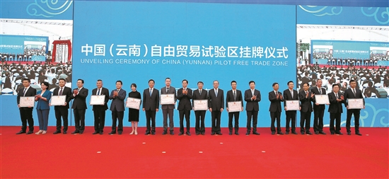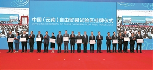 8月30日,中国(云南)自由贸易试验区挂牌仪式举行。陈豪、阮成发等为第一批落地企业颁发证照。本报记者 雷桐苏 摄