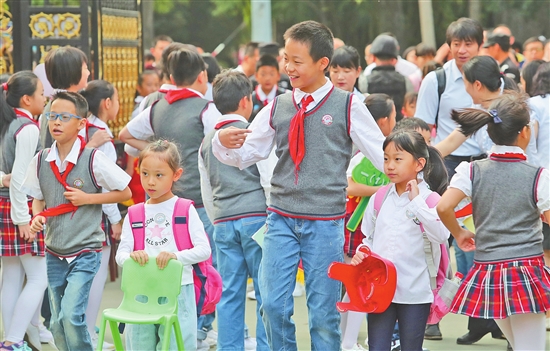 8月26日,昆明春城实验小学开展“大手拉小手”活动迎接新入学的一年级新生。春城小学通过重新进行班级教室的“高”“低”搭配、班级队列编排的“高”“低”搭配等形式,让各高年级班级与低年级班级、高年级同学与低年级同学之间通过“大手拉小手”的活动建立“1对1”的搭配模式,在校园营造不同年龄层的同学学习互帮、生活互助、游戏互动的开放空间,以此激发高年级同学的责任担当能力和提升低年级学生融入集体生活和沟通交流能力。据了解,春城小学将混龄教育模式全面引入小学校园教育在昆明还是首次。本报记者 杨峥 文/图