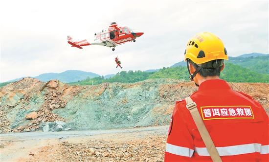 8月31日,在思澜高速公路第二合同段二工区糯扎渡服务区,云南交投集团联合多部门举行模拟当地地震应急救援演练,一架直升机参加演练,将“伤员”送往医院抢救。据悉,这是云南交投集团在公路工程应急救援演练中首次使用医疗救援直升机。本报通讯员 李文圣 摄
