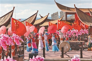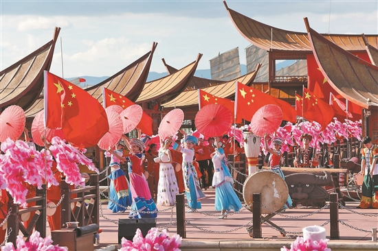 本报讯(记者 王宁 李秋明) 9月13日下午,七彩云南·古滇名城古滇艺海大码头人头攒动、锣鼓喧天。以太阳鼓、花瓣舞、孔雀舞等民间文化特色舞蹈为主要元素的联欢舞蹈迎来了《我和我的祖国》7城联动首映礼昆明站活动。