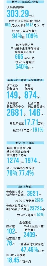 郎晶晶 治国有常,利民为本。民政工作关系民生、连着民心,离百姓最近,与百姓生活最密切。 党的十八大以来,全省民政系统以习近平新时代中国特色社会主义思想为指引,全面贯彻落实党中央国务院和省委、省政府关于民政工作的决策部署,认真践行“民政为民、民政爱民”工作理念,从最困难的群体入手、从最突出的问题着眼、从最具体的工作抓起,着力保障基本民生、创新基层社会治理、发展基本社会服务,民政事业发展取得新进展新成就,有力地服务了全省发展大局,进一步提升了群众的获得感、幸福感和安全感。 纾民困 密织社会救助保障网 查看身份证、户籍信息,询问月收入、生活情况,听取群众对申请人家庭状况的反映……通过“一核、二看、三听”的方式,对低保户进行量化评分,确保低保对象精准、数据精确。这样的走访,全省民政系统已经进行了近3个月。 今年6月20日起,省民政厅在全省部署开展“脱贫攻坚精准救助百日行动”,全面检查农村低保、特困人员救助供养、临时救助政策落实情况。目前这项工作即将收尾,全省比5月底新增农村低保对象1.7万人,通过自检自查,对建档立卡贫困人口中有劳动能力但未就业的低保对象,连续3次无正当理由拒不参加扶贫项目的,已减发或停发低保金,全省农村低保做到了应保尽保、应退尽退。 这是我省聚焦精准施保的又一有力举措。 近年来,我省民政部门聚焦服务全省脱贫攻坚大局,每年都拿出有力措施,持续用力打造“阳光低保”。在连续多年深入开展城乡低保专项治理的基础上,上线了云南省居民家庭经济状况核对平台,与公安、人社、工商、扶贫、残联、昆明市住房公积金管理中心等部门实现数据共享,让数据“跑腿”,不断精准识别低保对象。目前,该平台已累计开展信息核对579.64万人次,全省范围内基本实现应保尽保、动态管理、精准救助。 加快农村低保与扶贫政策衔接,全省各地农村低保标准与国家扶贫标准实现“两线合一”,149.17万名农村低保和特困人员纳入建档立卡范围,实行兜底保障、长期帮扶。 实施社会救助,保障困难群众的基本生活,是民政工作兜底线、保民生的重要体现。 省委、省政府始终把困难群众的冷暖放在心上,先后制定了《云南省社会救助实施办法》等系列政策文件,完善最低生活保障制度、医疗救助制度,加强和改进临时救助工作,全面建立特困人员救助供养制度和物价上涨挂钩联动机制,形成以最低生活保障、特困人员救助供养等基本生活救助为主,就业、教育、医疗等专项救助为辅,社会力量参与为补充的,具有本省特点的新型“8+1”社会救助制度体系。全省持续完善救助对象认定机制、信息共享和核对机制,加强救助资金监管,提升规范管理工作水平。坚持便民利民原则,积极推进减证便民和智慧政务,建立乡镇政府(街道办事处)社会救助“一门受理、协同办理”窗口,实现医疗救助“一站式”即时结算,确保困难群众求助有门、受助及时,让群众深切感受到党和政府的温暖。 数据的变化正是民生成绩单的有力见证: ——截至2018年底,全省城乡低保保障303.29万人,城乡低保平均标准分别达559元/人·月和3612元/人·年,较2012年分别增长94%和109%。城乡特困人员平均基本生活保障标准均提高到不低于665元/人·月,较2012年增长540%以上。 ——2013年以来,全省累计实施临时救助369.46万人次、医疗救助4134.43万人次。 ——全面建立困难残疾人生活补贴和重度残疾人护理补贴制度,累计发放补贴13.61亿元,惠及84.34万残疾人。 ——2013年以来,中央和省级累计投入社会救助资金779.2亿元。 ——2013年至2018年,全省累计销售福利彩票403.13亿元,筹集公益金122.95亿元,支持民生兜底和社会福利事业。 暖民心 让老有所养幼有所依 互联网时代,如何智慧养老?在云南,只要有一部手机,拨打“12349”,或通过省民政厅打造的“云养通”智慧养老服务平台App在线下单,就可以足不出户订购养老服务。入住后,扫描床位二维码即可获得老人每日的护理、日常起居等信息。 这样的体验得益于今年8月云南省“互联网+智慧养老”平台上线,这是我省在智慧养老服务领域迈出的一大步,也是省委、省政府多年来大力支持养老服务业发展、提升养老服务供给能力取得的又一成果。 截至2018年,我省60岁及以上老年人已经达到685万人,占总人口的14.18%。面对滚滚而来的“银色浪潮”,我省每年将养老服务建设项目列入全省10件惠民实事,充分发挥得天独厚的气候、环境等养生养老资源优势,紧紧围绕养老服务供给侧结构调整和供给能力提升,大力发展以居家为基础、社区为依托、机构为补充、医养相结合的社会养老服务,逐步形成专业化服务与志愿者服务相结合,有偿、低偿、无偿服务相衔接,政府、市场、社会互动的社会化养老服务新机制,让老年人在彩云之南幸福颐养天年。 坚持“放管服”思路,全面放开养老服务市场。出台了《云南省政府办公厅关于全面放开养老服务市场提升养老服务质量的实施意见》等一系列文件,完善政策支撑,降低准入门槛;2015年以来,省级每年安排5000万元资金,鼓励支持社会力量兴办养老服务机构,采用PPP模式引入社会资金2600余万元建设的省级老年公寓被列为全国示范项目。 持续规范养老服务市场,提高养老服务质量。连续3年在全省开展养老院服务质量建设专项行动,并出台了