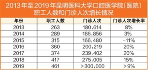 昆明医科大学口腔医学院前身为昆明医学院口腔系,1979年秋开始招收第一批五年制本科学生,1986年开始招收硕士研究生;2000年,口腔系更名为口腔医学院。2006年,由昆明医学院口腔系、昆明医学院第一、二附属医院口腔科组建成立附属口腔医院,2007年加挂云南省口腔医院牌子。2010年,云南省高等医学专科学校口腔系并入口腔医学院。经过40年的发展,昆明医科大学口腔医学院(医院)成为云南省高级口腔医学人才培养的重要基地、口腔医学研究平台和口腔疾病诊疗预防服务中心。 口腔医学院(医院)党委始终坚持把党的领导融入办医治院的各个环节,充分发挥党委的政治核心作用和领导作用,以及党支部战斗堡垒作用,把党的政治优势转化为医院发展优势,为学院(医院)的事业发展装上了动力强劲的“红色引擎”,育新人、创新业,为我省的口腔医学教育、研究和医疗的探索与创新,为提高全民口腔健康水平作出了重要贡献。 党建引领闯关过坎创新业 从杨善洲林场到会泽扩红基地,从建水朱德公园到龙陵李鑫纪念馆,铿锵有力的入党誓词回荡在云南省各偏远边疆地区。从2011年开始昆明医科大学口腔医学院(医院)走进边疆地区开展“党徽闪耀行动”,口腔专家和学生、党员干部、党员发展对象、入党积极分子赴边疆地区开展口腔健康宣传教育、义诊咨询和送温暖帮扶活动。这项饱含深意的公益活动,以党建为引领,将社会主义核心价值观与“立德树人”医德医师培养巧妙结合。借助这项永不断线的活动,昆医口腔人树立起了不求回报勇担责、兢兢业业干本职、全心全意为患者的精神。 近年来,面对云南经济社会发展和高等教育、医药卫生体制改革发展的新形势,面对过渡搬迁、加强基本能力建设等新任务,口腔医学院(医院)在昆明医科大学党委领导下,组织带领大家闯关过坎,创新创业。2015年2月,医院过渡搬迁。非常时期,院党委团结和带领教医护职工和学生凝心聚力,总体上实现了“医疗不断、教学不乱、队伍不散”的目标,职工总数从2015年的289人增加到如今的461人,医院年门诊量从17万人次增加到30万人次。 今年9月,院党委以扎实开展第二批“不忘初心、牢记使命”主题教育为契机,充分发挥党建引领作用,以医疗服务、教学改革、学科建设、社会服务、人才队伍建设为抓手,为实现跨越发展增添动力。 党建引领育人治病谋发展 “教书育人是天职,治病救人是本分,看病上课同兼顾是口腔医学院(医院)医师的职业特点,经过几代人努力,这支队伍不断壮大,医教研取得飞跃发展。”云岭名医许彪院长说。 细观口腔医院的发展,呈现出一条漂亮的微笑曲线。作为云南省最权威的口腔专科医院,今天的成绩靠的是其自身艰苦奋斗的历史积淀和几代口腔人的接续奋斗。 再来看看这一组组上升的数字: ——医疗服务能力持续提高。以省级临床重点专科建设为引领,医疗服务能力持续提高。口腔医院与昆明医科大学第三附属医院建立专科联盟,加入上海市第九人民医院牙颌面畸形诊治、牙体牙髓和牙周疑难疾病诊治、口腔正畸等4个专科联盟,成为“国家口腔疾病临床医学研究中心”成员单位;推进舒适牙科平台建设,在省级医院率先开展全身麻醉下儿童口腔疾病治疗;增设特需门诊服务和连锁门诊部建设工作,目前正在筹备第5门诊部,几乎覆盖昆明各大区域。患者门诊量稳步上升,门诊人次年平均递增近20%,手术台次从1806台增加到3456台。 ——学科科研能力稳中有升。近十余年来,共获得各级科研项目260余项,其中国家自然科学基金26项,全院师生发表论文630余篇,其中SCI、EI收录论文65篇,中文核心期刊论文570篇。出版专著、教材16部。 党建引领口腔医学绘新篇 以“红色引擎”为驱动,既是昆明医科大学口腔医学院(医院)40年育新人、创新业的重要动力,更是再赋华章、再绘新篇的重要动力。近年来,医学院(医院)基本形成了党委领导、院长负责、纪委监督、专家治学和民主管理的办医治院机制。 在科学的体制下,党建引领的作用不容小觑。正是因为瞄准了党员领导干部这个“关键少数”,口腔医学院(医院)才能充分发挥思想政治工作“先导力”,引导广大党员干部增强责任意识和担当精神,树立党员的先锋模范形象,最终筑起人人遵循的恪守教风学风和医德医风的精神高地。 口腔医学院(医院)仍将继续以“党徽闪耀暨口腔医师边疆行”等品牌活动为牵引,强化理想信念教育,扎实推进“不忘初心、牢记使命”主题教育,将主题教育成果转化为促进学院(医院)全面发展的生动实践。 大事记 ●1979年 昆明医学院口腔系开始招收五年制本科学生 ●1986年 开始招收硕士研究生 ●2003年 获批一级学科硕士点 ●2006年 昆明医科大学附属口腔医院建立 ●2007年 增名云南省口腔医院 ●2007年9月 获批云南省高校重点实验室 ●2011年 开始招收博士研究生 ●2013年12月 通过教育部口腔医学专业本科教学专业认证 ●2015年2月 从西山区人民西路193号过渡搬迁至高新区海源中路1088号和成国际写字楼过渡 ●2018年5月 通过口腔医学一级学科硕士学术学位授权点和硕士专业学位授权点合格评估 本报记者 王欢 通讯员 尹章成