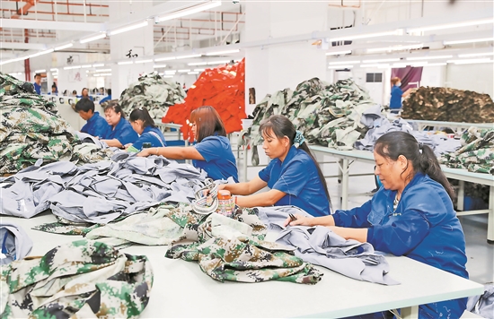 在实施易地扶贫搬迁过程中,泸水市结合当地实际,在多个易地扶贫搬迁安置点创建了形式多样的扶贫车间,帮助困难群众在家门口完成就业脱贫。依托怒江傈僳族自治州职教中心教育资源,扶贫车间可作为农村劳动力实训基地,让更多群众掌握一技之长,拓宽就业渠道。图为云南一鹤服饰有限公司扶贫车间。本报记者 李秋明 摄