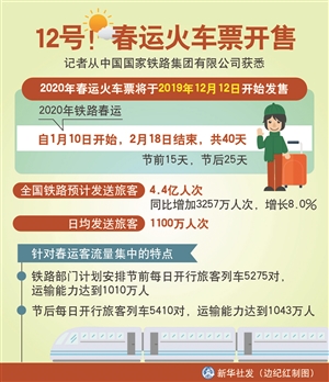 据新华社北京12月11日电(记者 樊曦 丁静) 记者从中国国家铁路集团有限公司获悉,2020年春运火车票将于2019年12月12日开始发售。2020年铁路春运预计发送旅客4.4亿人次,同比增长8%。 国铁集团相关部门负责人介绍,2020年铁路春运自1月10日开始,2月18日结束,共40天,节前15天,节后25天。全国铁路预计发送旅客4.4亿人次,同比增加3257万人次,增长8.0%,日均发送旅客1100万人次。 针对春运客流量集中的特点,铁路部门计划安排节前每日开行旅客列车5275对,运输能力达到1010万人;节后每日开行旅客列车5410对,运输能力达到1043万人。