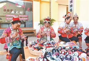 近年来,玉溪市江川区九溪镇矣文村委会积极发展民族手工刺绣产业,引导少数民族妇女居家就业,取得了良好的经济效益。图为农妇正在矣文村小龙茵刺绣传习馆创作彝绣产品。