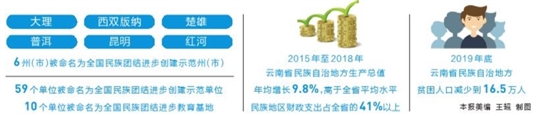 本报记者 程三娟 建设民族团结进步示范区的过程,是云南各民族共建美好家园、共创美好未来的过程。在这个过程中,千千万万民族同胞满怀对美好生活的向往,留下了自己奋斗的足迹。在此,我们撷取云南民族工作领域一些让人难忘的人和事,在回味中感知各民族共同团结进步的美好与繁荣。 云南是中华民族大家庭的一个缩影。习近平总书记2015年1月考察云南时作出重要指示,要求云南“努力成为我国民族团结进步示范区”。 5年来,在习近平新时代中国特色社会主义思想指引下,云南省委、省政府认真贯彻落实习近平总书记关于民族工作的重要论述和对云南工作的重要指示精神,始终坚持“在云南,不谋民族工作就不足以谋全局”的指导思想,牢牢把握各民族“共同团结奋斗、共同繁荣发展”的民族工作主题,推动少数民族和民族地区跨越式发展,深入实施民族团结进步创建工程,切实推进边疆民族地区治理体系和治理能力现代化,不断铸牢中华民族共同体意识,建设各民族共有精神家园,走出一条符合云南实际的民族团结进步新路子。 5年来,云南的民族团结进步创建工作全面深入推进,各地区各部门互观互鉴、比学赶超,“民族工作大家做,民族团结一家亲”的氛围更加浓厚。2019年4月,玉溪市新平彝族傣族自治县、峨山彝族自治县、元江哈尼族彝族傣族自治县,普洱市墨江哈尼族自治县、镇沅彝族哈尼族拉祜族自治县,楚雄彝族自治州双柏县,红河哈尼族彝族自治州石屏县7个县共同组成“民族团结进步创建联盟”,创造性促进民族团结进步创建工作深入全面开展。截至目前,全省共有大理、西双版纳、楚雄、普洱、昆明、红河6个州(市)被命名为全国民族团结进步创建示范州(市),59个单位被命名为全国民族团结进步创建示范单位,10个单位被命名为全国民族团结进步教育基地,获命名数量居全国前列。 5年来,云南各族干部群众奋勇争先、比学赶超的精气神不断提振,具有云南边疆民族地区特点的法规制度陆续出台,边疆民族地区治理能力不断提升,少数民族文化得到有效保护和传承,云南少数民族的面貌、民族地区的面貌、民族关系的面貌日新月异,少数民族群众生活蒸蒸日上。2015年至2018年,云南省民族自治地方生产总值年均增长9.8%,高于全省平均水平,民族地区财政支出占全省的41%以上。2019年底,云南省民族自治地方贫困人口减少到16.5万人。