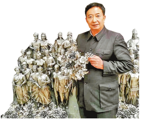 2019年国庆前夕,在首都北京举行的庆祝中华人民共和国成立70周年大型成就展上,由云南制作的“中华民族一家亲,同心共筑中国梦”银雕屏风前,留影者络绎不绝。 屏风上,56个民族的兄弟姐妹肩并肩、意气风发;屏风前,全国少数民族参观团的民族代表身着盛装共聚一堂,生动渲染出一幅中华民族一家亲、同心共筑中国梦的和谐共融画面。 这面颇受瞩目的大型银雕屏风,由鹤庆县新华村的白族银器制作代表性传承人、中国工艺美术大师寸发标率团队设计创作而成。 2013年,在国家民委倡导下、省民族宗教委积极筹措资金支持下,寸发标率工作团队开始了“中华民族一家亲 同心共筑中国梦”大型银雕屏风的创作,2017年8月制作完成,入选“砥砺奋进的五年”大型成就展,党的十九大召开前夕在北京市展览馆展出。 “我从16岁开始挑着担子外出讨生活,到过很多民族地区,接触过很多民族同胞,特别能体会到各民族之间平等团结、亲如一家的关系,特别能感受到民族地区和民族同胞生活沧海桑田、旧貌新颜的巨大发展变化。”寸发标说。 寸发标的创作灵感既有饥肠辘辘、疲惫不堪时招呼他们用餐留宿的哈尼族老爷爷,让女儿认他这个小银匠做干爹的瑶族大姐,还有过世许久但微笑面庞一直刻在他脑海中的白族母亲,但更多的灵感还是来自对家乡的感知。 在各级党委、政府关怀支持下,新华村这个白族村寨从昔日的“寡妇村”变为繁荣昌盛的“中国银都”,成为全国特色景观旅游名镇名村示范。 鹤庆县共有25个民族,大理白族自治州是全国民族团结进步示范州,“各民族都是一家人,一家人都要过上好日子”是这里民族工作的最好写照。全国闻名的民族团结进步“郑家庄”样本就在这里。 “屏风的创作灵感来自对家乡民族团结的切身体验,来自对中华民族大家庭深沉的爱。我想把自己对祖国、对家乡的热爱和美好祝愿表达出来。”寸发标说。