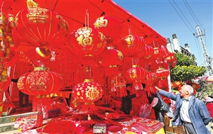 春节临近,大红的灯笼和吉祥的中国结把腾冲的大街小巷装扮得格外喜庆。腾北市场上商品琳琅满目,供应充足,前来选购年货的市民络绎不绝,对联、灯笼、米花糖等年货持续热销。本报记者 杨峥 摄