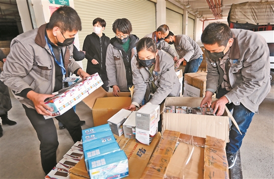 连日来,位于昆明高新区和呈贡区的云南省新型冠状病毒感染肺炎疫情捐赠物资储备库,工作人员不分昼夜、加班加点及时搬运、清点、收储来自全国各地以及海外的捐赠物资,并按照发放流程为疫情防控最需要的地方快速转运分配物资。图为高新区昊邦药业捐赠物资储备库,工作人员在接收清点捐赠物资。本报记者 杨峥 摄