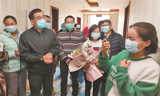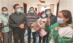 2月25日中午,听到有人敲门,云南医疗队护士高娇打开了门。 “生日快乐!”门外的声音把她吓了一跳。 高娇头天上晚班,回到住所收拾洗完已经凌晨四点了。早上起的稍晚了点,但从睁开眼睛,感动就源源不断地涌来。远在昆明的同事们,一早就给她录了视频,一起在昆明给她祝福生日快乐。中午,咸宁市政府秘书处的同志们,早早就给她准备了鲜花。没有蛋糕,一个简单的糕点代替,没有生日大餐,一碗长寿面送来。 当然,她最开心的还是轮休的同事们都来了。云南支援湖北医疗队前方指挥部指挥长许勇刚、几位副指挥长和指挥部领导,一起来给她唱《生日快乐》歌,还送上2个苹果,祝福高娇平安快乐。 听说高娇刚刚结婚两个多月就选择来咸宁加入战疫。许勇刚说:“你老公知道你生日吗?给他打个电话,报一声平安吧。”视频电话接通,视频那头高娇的老公何照雄看到这么热闹的场面,也放下了心,祝福老婆生日快乐,感谢领导、同事们陪伴爱人一起过这个特别有意义的生日。 当天下午,何照雄还给指挥部发来一封感谢信。感谢信中说:我是云南省第三批援鄂抗疫医疗队成员高娇的家属,今天你们一起给高娇过了一个难忘又感动的生日,在此我由衷地对各位领导和全体医疗队队员们说声谢谢!在此,祝福全体奋战在一线的抗疫英雄们早日平安回家,带着使命出去,平安健康归来。你们是最可爱的人,低调但很伟大。 云报全媒体记者 李荣 杨峥 发自湖北咸宁