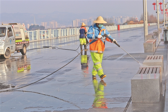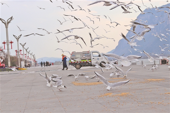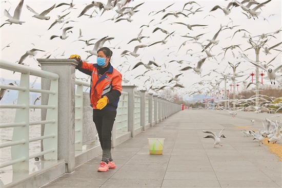 每年冬季,红嘴鸥都会从西伯利亚不远万里相约春城,上演鸥欢人和的美好画面。今年,滇池之畔少了市民投喂海鸥的身影,但环卫工人们依然每日前往滇池大坝,当好红嘴鸥的“铲屎官”,守护美丽春城。 记者日前在滇池大坝看到,2.5公里长的大坝被成千上万只红嘴鸥“占领”,海鸥粪便覆盖一地。环卫工人们只能手持高压水枪,一点点冲刷。清洗完毕后,再喷洒上84消毒液。 “虽然滇池大坝暂时封闭,没有游客,但红嘴鸥一直还在,并且洗扫、消杀工作丝毫不能马虎,甚至要更精细。”云南京环海洁公司工作人员李刚介绍,正常情况下,大坝上鸥粪并不多,每周或隔周彻底清洗一次鸥粪即可。但景区关闭以后,工作人员每天会给红嘴鸥集中投两次食物,导致它们在大坝上停留时间较长,鸥粪增加,几乎布满了整个大坝。 连日来,为保证大坝整洁干净,环卫工人们每周需要清洗两次鸥粪,每次出动6至7台步道车,耗时两天半时间完成清扫。除了要做红嘴鸥的“铲屎官”,一线工人们还要对滇池大坝周围的垃圾桶、绿化带等重点区域进行消毒。 本报记者 浦美玲 通讯员 张博 摄影报道