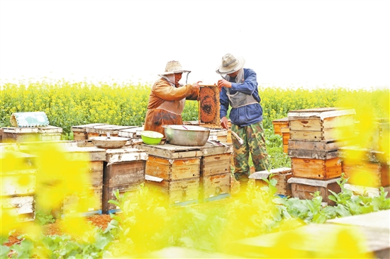 眼下,罗平县百万亩油菜花正值盛花期,成片的金色花海美不胜收。来自全国各地的200余户养蜂人带着他们饲养的3万余群蜜蜂在花海间忙碌,采花酿蜜,酿造甜蜜生活。本报通讯员 刘景威 卢永 摄影报道