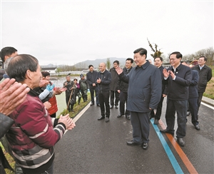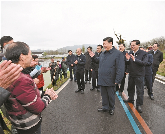 3月30日,习近平前往湖州市安吉县天荒坪镇余村村考察调研。2005年8月15日,时任浙江省委书记习近平在该村考察时首次提出“绿水青山就是金山银山”。15年来,余村坚定践行这一理念,走出了一条生态美、产业兴、百姓富的可持续发展之路,美丽乡村建设在余村变成了现实。在村党群服务中心,习近平详细了解余村发展情况,对他们发展绿色经济、带动村民增收致富的做法给予肯定。