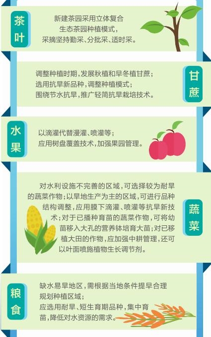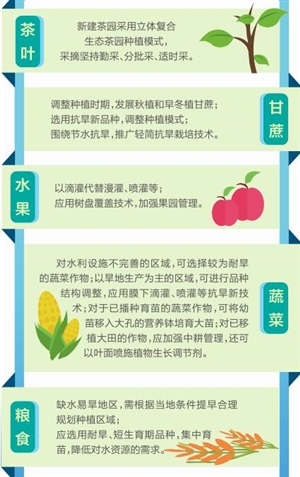 本报记者 陈云芬 视点 近期我省持续高温少雨天气,多地出现干旱,跟天气息息相关的农业生产受到了不同程度的影响。如何科学应对,减损增效?云南省农业科学院组织有关专家对全省气象干旱的农业产业影响进行了调研,并提出了农业科技指导意见。 春季干旱较常年偏重 对春季采收作物影响较大 2019年2月以来,我省部分地区气温偏高,降水偏少,其中滇中以南大部地区较常年偏少30%、局部偏少50%以上,滇中的西部、滇西北的东部较常年偏少20%至50%。据气象部门预测,未来一段时期,全省大部分地区将进入气象干旱快速发展期,气候情况总体较常年偏差,气象干旱持续时间较常年偏长,干旱强度总体将较常年偏重,并将持续至初夏雨季开始前。 “目前正值芒果、李子、桃、梨、苹果等水果盛花期及末花期,部分水果开始进入坐果期,由于春季干旱,缺乏灌溉条件的果园已经出现了落花落果现象,新定植的水果幼苗出现叶片萎蔫、树干开裂、植株干枯等缺水症状。”“受春旱的影响,旱地种植为主的蔬菜作物无法正常耕种,春播蔬菜如辣椒、西兰花、春甘蓝、春白菜、甜玉米等作物面积有所减少。”“粮油作物方面,麦类主要面临田间杂草、蚜虫、条锈病等问题;受干旱影响,蚕豆、豌豆总干物质产量减少;玉米、马铃薯小春多种植于水利条件较好的田块,大春处于备耕及育苗期,影响不明显;油菜正值收获期,影响相对较小。” …… 专家分析,目前干旱对云南多年生春季采收的茶叶、甘蔗、蚕桑、咖啡、中药材等作物影响较大,对水果、蔬菜、粮油作物等也有不同程度的影响,而花卉、草莓、猕猴桃、葡萄、魔芋等特色作物多具有较好设施条件或未到萌发期,影响相对较小。 重管理防病害选良种 记牢这些抗旱减损“妙招” 如何科学应对,减少干旱对农业生产的影响?专家针对不同作物开出相应的抗旱“科技处方”。 就茶叶产业来说,专家提出,新建茶园时,采用立体复合生态茶园种植模式,加强有灌溉条件的茶区灌溉。利用稻草、玉米秸秆、绿肥等覆盖茶树行间及根部,在茶树行间铺草调节土壤温度,减少土壤水分蒸发,铺草厚度为10厘米左右。有条件的平地、缓坡地茶园,可用塑料遮荫网遮荫,遮荫网高出茶树蓬面50厘米左右为宜,幼龄茶树可采用树枝遮荫或者搭建遮荫小拱棚。选用液体有机肥进行浇施,增强茶树的抗旱力。干旱期间茶叶采摘应坚持勤采、分批采、适时采的原则,减少留叶量,减少茶树水分的消耗。 对于甘蔗产业,专家认为,可调整种植时期,根据云南自然气候条件,大力发展秋植甘蔗和早冬植甘蔗。选用“云蔗05-51”“云蔗08-1609”“粤糖86-368”“德蔗03-83”等抗旱甘蔗新品种。调整种植模式,围绕节水抗旱,坚决实行“两改”,一是改甘蔗种前土地翻犁为夏秋翻犁,二是改传统的浅耕浅种为深沟板土深种。推广轻简抗旱栽培技术,开沟、种植、覆膜一气呵成,千方百计利用和保持土壤水分,实现旱作甘蔗丰产高效栽培。 “芒果、李子、桃、梨、苹果等水果正值盛花期及末花期,部分水果开始进入坐果期,加强田间管理是关键。”专家认为,对水果产业来说,应重视基础水利设施的建设,以滴灌代替漫灌、喷灌等传统用水方式;应用树盘覆盖技术,有效减轻土壤水分的蒸发损耗,加强果园管理以减少土壤蒸发与植株蒸腾。 对于蔬菜产业,专家建议,对水利设施不完善的区域,可选择小米椒、豌豆、甜玉米、茄子等较为耐旱的蔬菜作物,避免种植需水较大的蔬菜作物,如叶菜类的白菜、甘蓝、生菜、菜心、芥蓝,瓜类的黄瓜、丝瓜等。以旱地生产为主的区域,可进行品种结构调整,应用膜下滴灌、喷灌等抗旱新技术,完善灌溉条件;种植采用高畦打塘定植,定植口覆细土减少水分蒸发。对于已播种育苗的蔬菜作物,如因干旱无法下地种植的,可将幼苗移入大孔的营养钵培育大苗,待条件成熟再移植大田,移植大田后加强水肥管理,确保不影响产量和品质。对已移植大田的作物,无土膜覆盖的,应加强中耕管理,还可以叶面喷施植物生长调节剂,增强植物抗旱能力。 目前,水稻、玉米等正处于备耕和育苗关键期。专家认为,合理规划种植区域布局、水利灌溉是防止干旱的根本办法。缺水易旱地区,需根据当地的水资源和灌溉条件,提早合理规划种植区域,宜稻则稻,不宜的则改种旱作物。应选用耐旱、短生育期品种,有条件的地方集中育苗,降低对水资源的需求。 瞄准设施农业数字化农业 着力打造节水高效农业生产体系 专家提出,云南气候主要是亚热带高原季风气候,干湿季节分明,其中5月至10月的雨季集中了85%的降水量,11月至4月的旱季降水量只占全年的15%,季节性缺水情况比较突出。为此,我省农业生产要树立抗旱农业生产的思维,有旱抗旱,无旱备旱,逐步形成具有高原特色的节水高效现代农业产业生产体系。 改善农业水利条件, 提高抗灾能力。我省水资源相对丰富,但工程性缺水严重,要充分利用我省澜沧江、怒江、金沙江、元江、伊洛瓦底江、南盘江6大水系的优势,科学布局、合理开发利用丰富的水资源,改变“山下河水流,山上渴死牛”的状况。加大“五小”水利的建设力度,有计划地新建水利工程,做到有水可用,有水能用,努力扩大耕地灌溉面积。 建设设施农业体系,提高水资源利用率。以打造世界一流“绿色食品牌”为契机,发展温室花卉、温室蔬菜、温室水果等,采用数