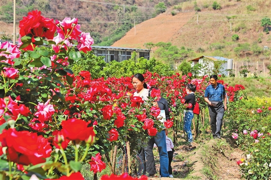 4月以来,泸水市六库镇小沙坝村委会新村50多亩月季竞相绽放、争奇斗艳,吸引了众多游客。