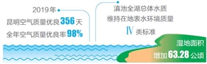 本报记者 浦美玲 文/图 今日观察 蓝天碧水、空气清新、气候宜人,是昆明的靓丽名片。一张纯净的蓝画布,让昆明这座城市增添了温柔的底色,衬得山河更加秀丽。 2019年,昆明市坚持绿水青山就是金山银山的绿色发展理念,不断深化生态文明体制改革,以改善生态环境质量为目标,全力打好蓝天、碧水、净土保卫战,厚植全省生态文明建设排头兵底气。 海菜花重现滇池 滇池草海大泊口水域湖面,朵朵海菜花疏密有致、随波荡漾。湖水清澈,花瓣洁雅,衬托着蓝湛的天空,好一幅醉人的明净山水画。 “海菜花是我国珍稀水生植物,只有在温暖清澈的水域才会出现,被称为‘水质试金石’。”昆明滇池高原湖泊研究院相关人员介绍,近年来,随着滇池保护治理工作的推进,滇池水质有了明显改善,许多消失的水生植物再次出现在不同水域。通过昆明市滇池生态研究所在大泊口水域开展湖内生态修复示范工程,这一片水域透明度能够达到1.1米至1.3米,比较适合海菜花的生长。 近年来,昆明市坚持“量水发展、以水定城”,研究提出“科学治滇、系统治滇、集约治滇、依法治滇”的思路,按照“技术上综合、管理上严格、治理上广泛”的保护治理原则,推动滇池保护治理实现工作内涵由单纯治河治水向整体优化生产生活方式转变、工作理念由管理向治理升华、工作范围由河道单线作战向区域联合作战拓展、工作方式由事后末端处理向事前源头控制延伸、工作监督由单一监督向多重监督改进、保护治理由政府为主向社会共治转化的“六个转变”,滇池保护治理的科学化、系统化和集约化水平不断提高。2019年实施滇池保护治理工程175个,完成投资60.29亿元。昆明市22条城市河道黑臭水体基本消除,入选国家城市黑臭水体治理示范城市。阳宗海水环境保护治理工作取得积极成效,阳宗海水质保持Ⅲ类标准,湖体水质持续向好,阳宗海时隔11年首次开湖捕鱼。 昆明市还推进河(湖)长制工作从“名”到“实”转变,一年来,各级河长共巡河900余次,发现并整改问题400余个。同时,狠抓“一河(湖)一策”实施,全面启动6条重点河道整治工作,目前,已完成沿湖沿河截污管网建设64.26公里。 2019年,滇池全湖总体水质维持在地表水环境质量Ⅳ类标准,营养状态为轻度富营养,与2018年相比水质保持不变。35条入滇河流中,综合达标率为93.9%。列入国家考核的12条河道全部达到国家对滇池“十三五”规划水质目标要求。全市22个县级以上集中式饮用水源地中21个水源地均达到或优于Ⅲ类水质,达标率为95.5%。 随手一拍都是美景 微博和微信朋友圈上,经常可见市民和游客晒蓝天、晒美景的图片。“抬手一拍,都是干净、透亮的景致,不需要滤镜和美颜。”站在船房河边拍下几幅照片后,市民王然发帖分享。 为打赢蓝天保卫战,昆明市用新的思路、新的举措全面提升环境空气质量,推进大气污染防治各项工作,实现年度空气质量改善目标。为巩固提升全市环境空气质量,降低臭氧对环境空气质量的影响,同时有效保障2020年《联合国生物多样性公约》第十五次缔约方大会和第七届中国国际友好城市大会期间环境空气质量,制定并实施了《昆明市环境空气质量提升保障及臭氧防控工作方案》。昆明市还建立了大气环境预测预警业务化系统平台,依托该系统平台,每天根据空气自动监测情况结合气象条件对空气质量进行预判。2019年共发布空气质量预警通知26次。 2019年,昆明主城区大气环境质量达到《环境空气质量标准》二级标准,环境空气质量全年有效监测365天,按AQI指数评价,空气质量优良356天,全年空气质量优良率98%。同时,节能减排方面,2019年圆满完成省下达的淘汰落后产能和压减过剩产能任务,退出过剩行业电解铝产能10.16万吨。 “相对于大气和水污染,土壤污染更为隐蔽、更难治理,昆明市协调推进、综合施策,科学打好净土保卫战。”昆明市生态环境局相关负责人介绍,全市续推进净土保卫战2019年度目标任务,确保实现2020年全市土壤污染防治目标。目前,基本完成了重点行业企业用地基础信息调查工作,全市共有调查对象495个,其中重点行业企业386个,尾矿库109个,正在开展调查地块采样工作。各县(市、区)建立企事业单位重金属污染物排放总量控制制度,已按照省市下达任务,完成2019年重金属减排计划,重金属污染物排放量比2013年消减12.09%。 滇池湿地成网红打卡地 曾在中央电视台获“中国最美湿地”称号的滇池湿地,是昆明一张靓丽名片。 昆明市在着力推进滇池治理“六大工程”的同时,于2008年起启动了滇池“四退三还”生态建设,在环湖区域规划并实施湿地建设工程。经过10多年的生态修复工作,滇池湖滨已经初步构建了一条平均宽度为200米、面积约为33.3平方公里、区域内植被覆盖率超过80%的闭合生态带,形成了一条以自然生态为主、结构完整、功能完善的湖滨生态绿色屏障。建成环湖湿地5万余亩,在滇池的演化历史进程中,首次实现“湖进人退”。 “滇池湿地建设对修复滇池生态系统、改善滇池水质产生了积极的效果。”昆明市滇池管理局相关负责人介绍,这些湖滨湿地将名副其实地发挥“滇池之肾”的作用,不仅大大提升了水质净化能力,还吸引了众多野生鸟类“安营扎寨”。 滇池边,越来越多的湿地成为网红打卡地。这里,春日花更红,夏季风更清。数据显示,2019年,昆明市自然生态环
