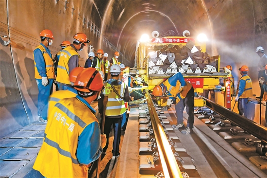 本报讯(记者 胡晓蓉) 经过近5年的紧张施工,6月15日上午,大临铁路开始铺轨,标志着大理至临沧这条云南“八出省五出境”铁路网中的重要通道建设进入攻坚冲刺阶段,为全线按期开通运营打下坚实基础。 当天上午,在大理站西端,随着现场指挥人员一声号令,铺轨牵引车缓缓向前移动,20分钟后,两条长500米、重30吨的钢轨平稳落在道床上,全线铺轨工作正式展开。目前每天约有450名工人在全力奋战,确保6月30日前完成前期47公里的铺设任务。 大临铁路自大理站经大理市、巍山县,跨越澜沧江后,经临沧市云县至临翔区。铁路全长202公里,为国铁Ⅰ级单线电气化铁路。